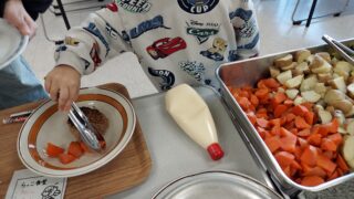 2025年4月12日土曜日 みやぎ生協多賀城店メンバー室をお借りして、「じゅわっとハンバーグランチ」開催しました。11組の親子さん、赤ちゃんから大人までの皆様にご参加いただきました。ボランティアさんは6名の方にご尽力いただきました。通常より少ないメンバーでしたので、事務局2名もフル稼働してみんなで駆け足で食事の準備を整えた回になりました。ボランティアさんお一人お一人のご尽力のありがたさが骨身に染みました。今回はパスタのミモザサラダと里芋の胡麻和えをご用意しました。らっこ広場では季節の旬の食材を丁寧に仕上げた副菜も、大切に意識してお作りしています。野菜をはじめ苦手な食べ物があるお子さんには、らっこ広場の「野菜や食べたくないものは食べなくて大丈夫」ルールがあります。次回からは野菜が苦手なお子さんが困らないように、副菜をハンバーグとお一緒に盛らないで、ビュッフェ式にとりわけるように用意してみます。「うちの子は野菜嫌いだから、苦手だから」のお父さんお母さんも、ご心配なさらずにらっこ食堂に参加してみてください。おじちゃんおばちゃんたちが、ほかほかご飯を炊いて、皆様のお越しをお待ちしております。